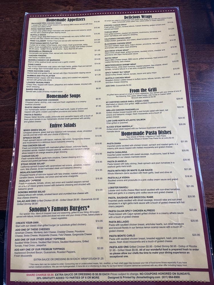 Sonoma Grill, located in Holtsville, NY, offers a diverse menu of pizza, American cuisine, and a selection of wines. Known for their generous portions and flavorful dishes, Sonoma Grill is a go-to spot for casual dining with options for vegans and vegetarians. The restaurant boasts a variety of amenities including live music, outdoor seating, and a full bar. Customers rave about the delicious burgers, wraps, fries, wings, and crab cakes. The restaurant's happy hour specials, including half-priced pizzas, make it a popular choice for those looking for a great deal. While some reviewers mention the need for more vegan options, overall, Sonoma Grill impresses with its friendly staff, cozy ambiance, and convenient location within the Holiday Inn. Whether you're looking for a laid-back dinner or a fun night out, Sonoma Grill is worth a visit.